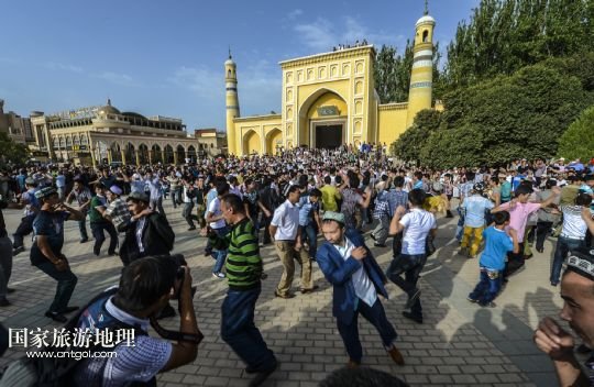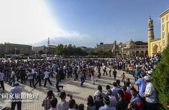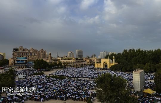 當日,近3萬名各族穆斯林群眾前往新疆最大清真寺——艾提尕爾清真寺做禮拜,喜迎開齋節(jié)。