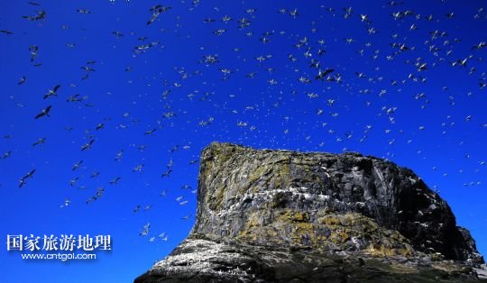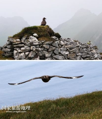 登上圣基爾達(dá)島并非易事,記者因風(fēng)高浪大在外赫布里底群島等待多日才有船出海。僅可乘載10余人的小船在風(fēng)浪中穿行了近3個(gè)小時(shí),圣基爾達(dá)島終于出現(xiàn)在霧色籠罩的海面上。島上散落著十余座已經(jīng)荒蕪破敗的石舍和幾百個(gè)儲(chǔ)物石室,這些殘存的遺跡早已成為野羊與海鳥的巢穴,人類反而成為外來的訪客。人類文明的消失為一些稀有的物種和瀕臨滅絕的鳥類提供了安全的棲息地。島上陡峭的山坡隨處可見野羊悠然漫步,而那些嶙峋的峭壁和海礁則棲息著數(shù)十萬只各類海鳥。世界上最大的塘鵝群——約6萬對塘鵝在這座海島及附近的海礁上繁衍生息。