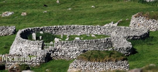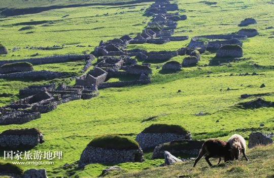 國家旅游地理 英國倫敦8月14日訊 在圣基爾達(dá)島已經(jīng)遺棄的村落旁的山坡上,有用石頭圍墻圈起的一塊塊耕地。當(dāng)年在島上定居的村民在這些石圈內(nèi)鋪墊海藻,種植少量谷物。一個(gè)個(gè)形狀各異的石圈保護(hù)著這些寶貴的谷物免遭風(fēng)暴與家畜的侵害(7月19日攝)。
