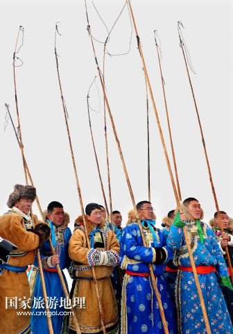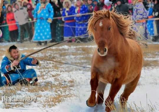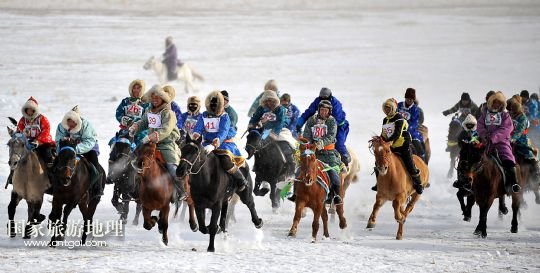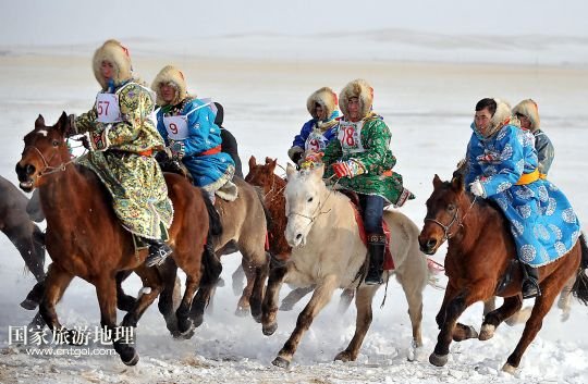 國(guó)家旅游地理 內(nèi)蒙古錫林郭勒1月5日訊 1月4日,牧民們?cè)谫愸R比賽中。當(dāng)日,2014年“銀色西烏珠穆沁”杰仁馬文化節(jié)在內(nèi)蒙古錫林郭勒盟西烏珠穆沁旗舉行。當(dāng)?shù)孛晒抛迥撩裆碇A麗的服飾,帶著自家的馬匹,冒著風(fēng)雪嚴(yán)寒,從四面八方趕到會(huì)場(chǎng),參加了賽馬、套馬、乘馬拾物、蒙古馬選美等多項(xiàng)比賽,吸引了來(lái)自全國(guó)各地的游客、攝影愛(ài)好者以及附近的大批牧民。 /新華社記者任軍川攝