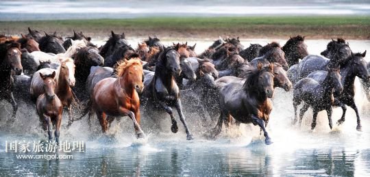 國(guó)家旅游地理 1月30日訊 一群蒙古馬在內(nèi)蒙古錫林郭勒盟阿巴嘎旗涉水奔馳(2013年7月20日攝)。風(fēng)從草原吹過,留下多少傳說(shuō)。在內(nèi)蒙古草原,駿馬與人為伴,縱橫馳騁,一直和諧相處到今天。在漫長(zhǎng)的歷史長(zhǎng)河中,駿馬陪伴著人們走過了滄桑歲月,留下了許多可歌可泣的動(dòng)人傳說(shuō)。