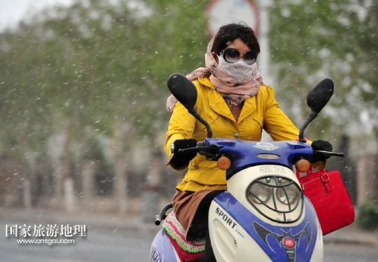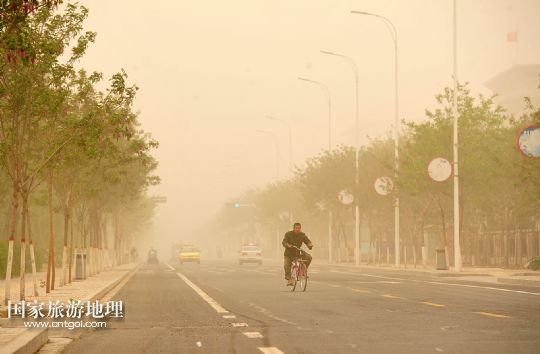 國家旅游地理 寧夏中衛(wèi)4月24日訊 4月24日,在寧夏回族自治區(qū)中衛(wèi)市,一位市民在沙塵天氣中騎行。當日,寧夏回族自治區(qū)中北部地區(qū)遭遇強沙塵天氣,寧夏氣象臺于當日7時40分發(fā)布沙塵暴黃色預警信號:預計未來12小時內全區(qū)大部有5-6級偏北風,陣風7-8級,伴有揚沙或浮塵天氣,銀川、石嘴山、吳忠、中衛(wèi)四市的部分地區(qū)可能出現能見度小于1000米的沙塵暴天氣。 /新華社記者 彭昭之 攝