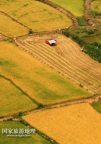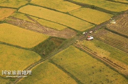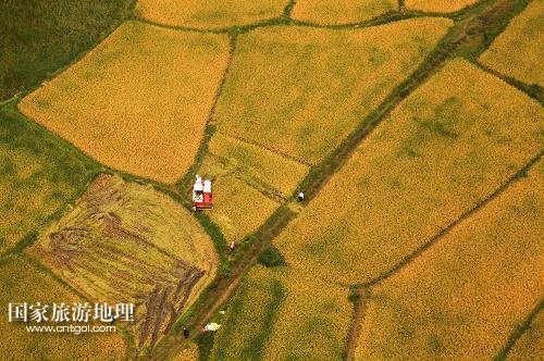 國家旅游地理 江蘇淮安9月27日訊 這是9月26日航拍的江蘇省淮安市盱眙縣鮑集鎮(zhèn)稻田收獲圖景。近期,江蘇省各地的水稻產(chǎn)區(qū)陸續(xù)開鐮收割。收割機(jī)踏著大地的指紋收獲金黃的稻谷,繪就一幅幅美麗的豐收圖畫。新華社發(fā)(周海軍 攝)