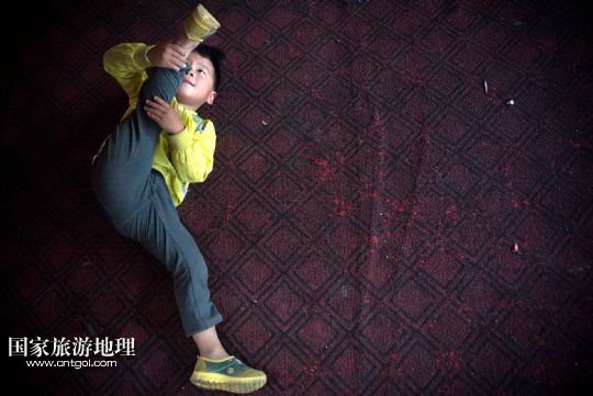 剛來到這里的孩子都要從最基本的壓腿、翻跟頭等基礎(chǔ)訓(xùn)練學(xué)起,練好基本功后大部分孩子會離開學(xué)校,過幾年長大一些再回來學(xué)些雜技表演動作,學(xué)得好就可以上臺參與表演。