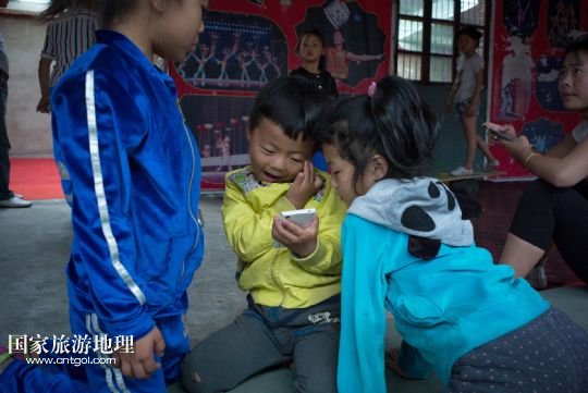 5歲孩子欒豪豪(中)和自己6歲的姐姐欒星星(右)在訓(xùn)練間隙玩手機(jī)游戲(5月26日攝)。